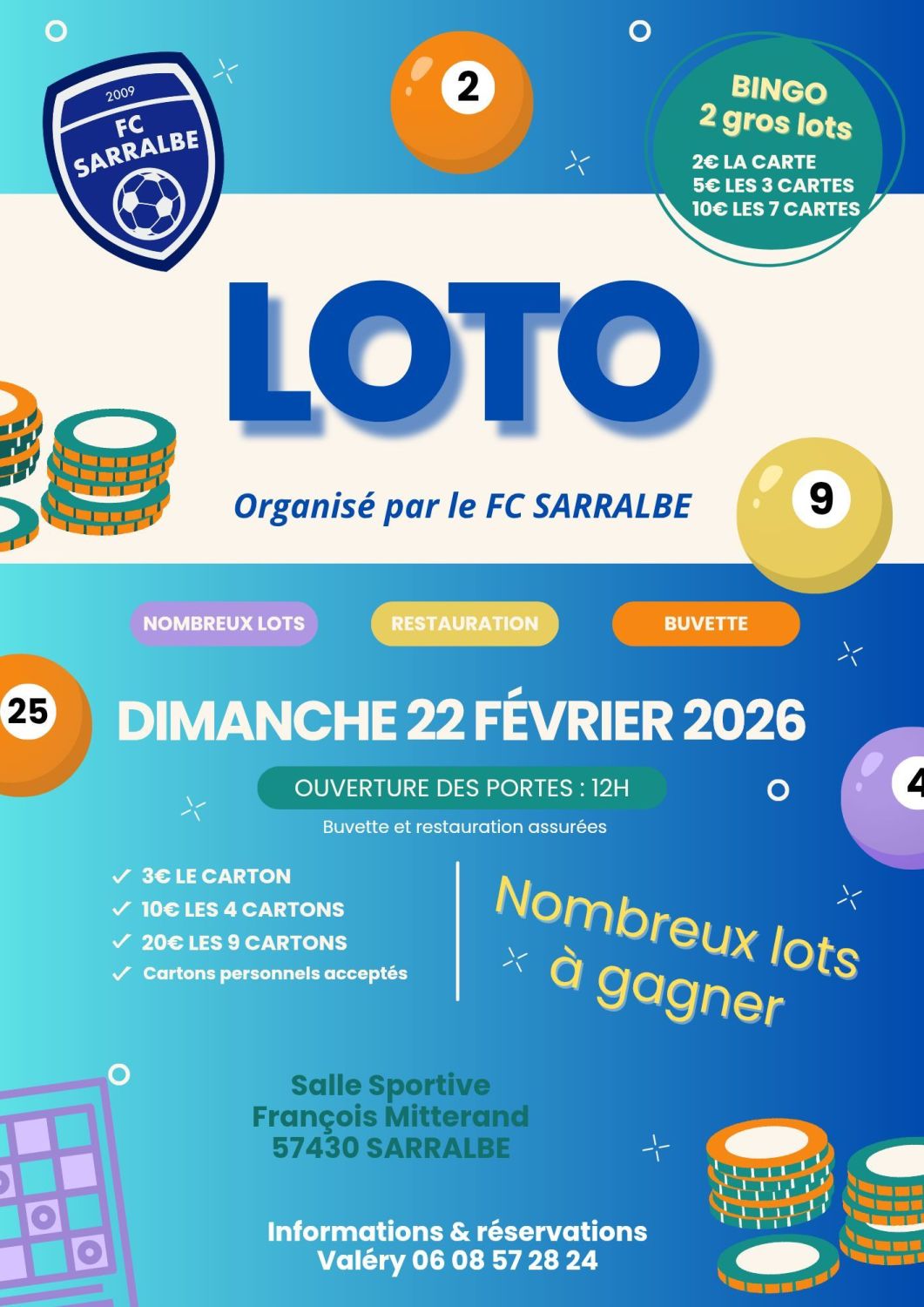Agenda 2ème Loto du FC Sarralbe Agenda 2ème Loto du FC Sarralbe 22 févr. 2026 Complexe François Mitterrand Le FC Sarralbe organise son deuxième Loto. Rendez-vous dimanche 22 février 2026 dans le gymnase du complexe François Mitterrand. Ouverture des portes à 12h, début du loto à 14h Buvette & petite restauration seront (évidemment) assurées. Je partage