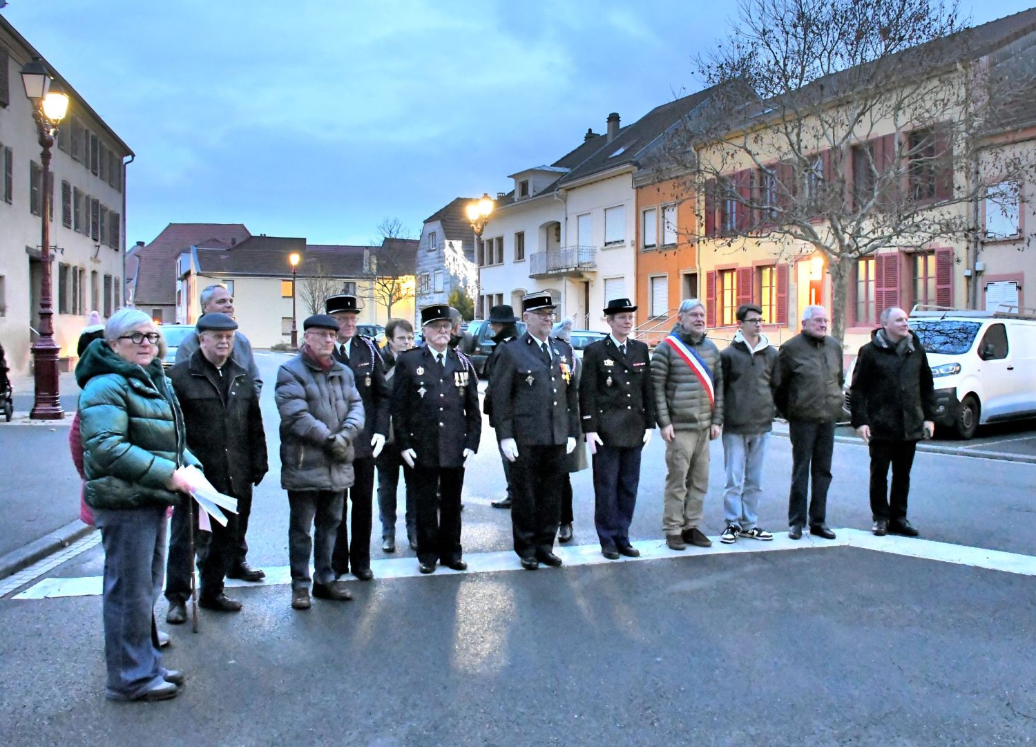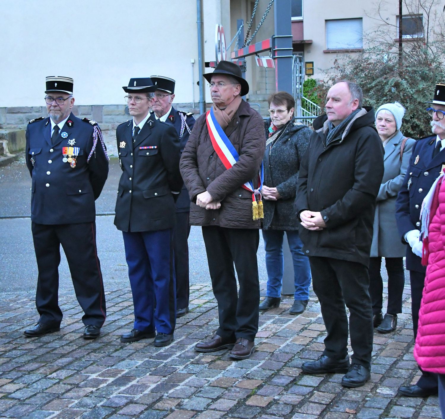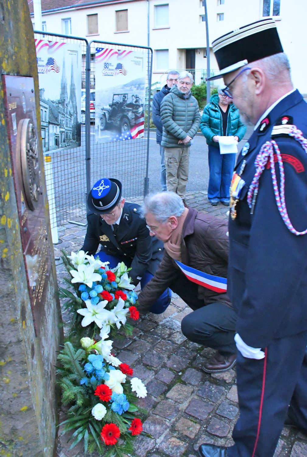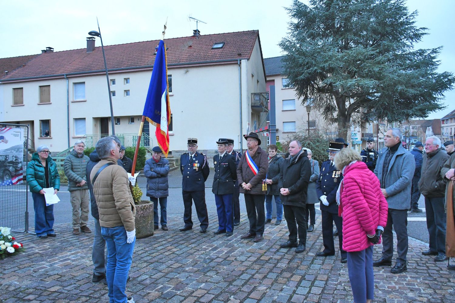 Deux commémorations ont eu lieu ce vendredi 5 décembre 2025 à 16h30. Les autorités civiles et militaires, accompagnées d’un porte-drapeau et des élus, se sont d’abord rassemblées autour de la stèle du square Patton pour honorer les jeunes soldats américains tombés pour la liberté et rappeler le 81ᵉ anniversaire de la libération de Sarralbe, survenue le 5 décembre 1944. Cette stèle, voulue par le regretté Paul Bodot, marque l’emplacement où les troupes américaines établirent leur liaison.