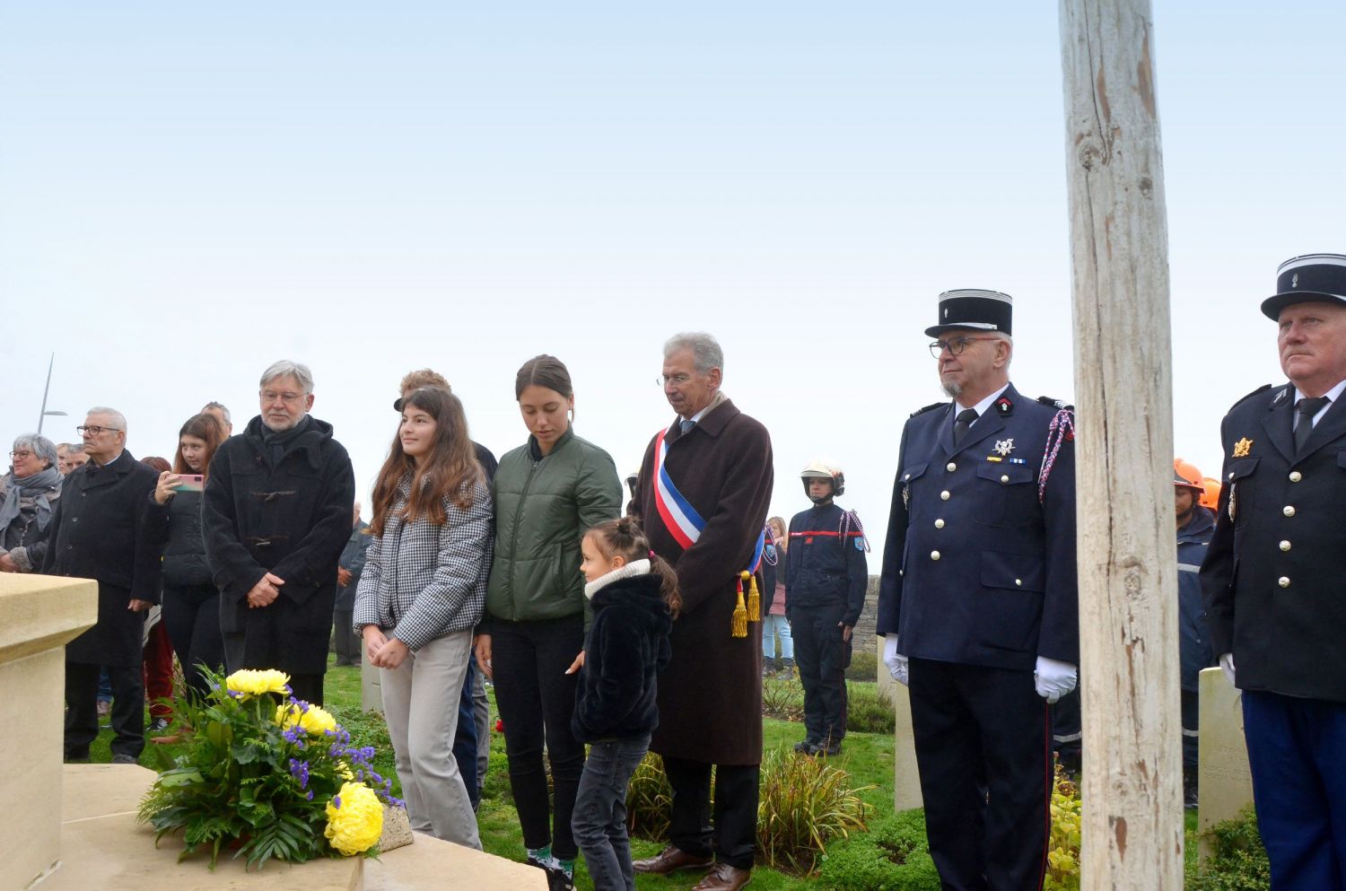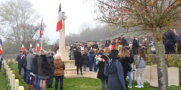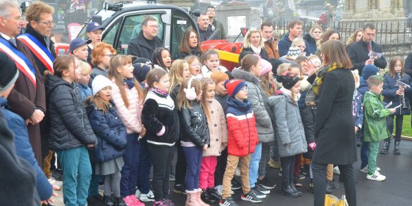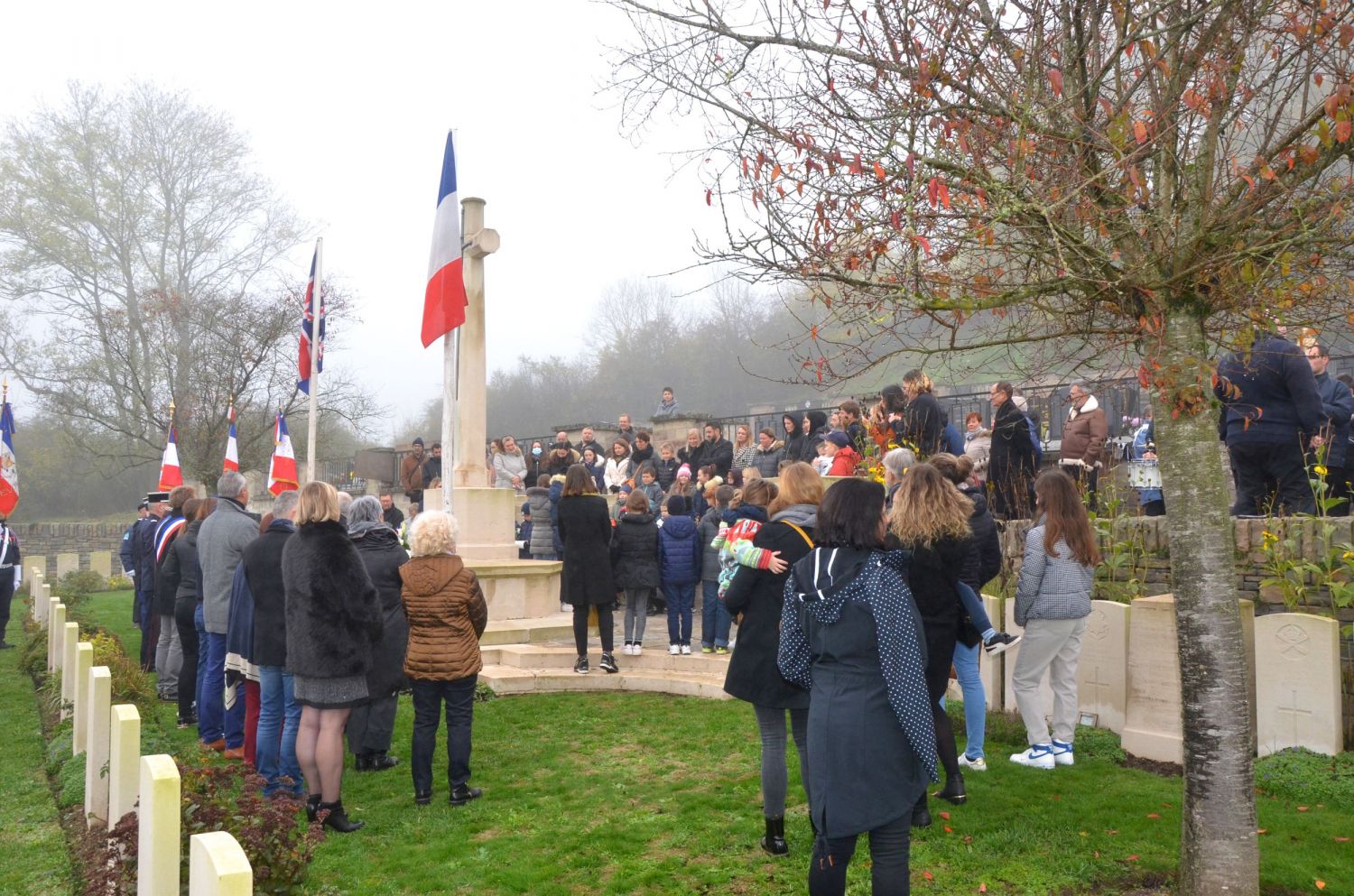 Au cimetière militaire Anglais du Commonwealth les enfants de nos écoles, sous la houlette de leur maîtresse d’école ont entonné la Marseillaise et l'hymne britannique (God Save the King) suivis par la musique municipale.