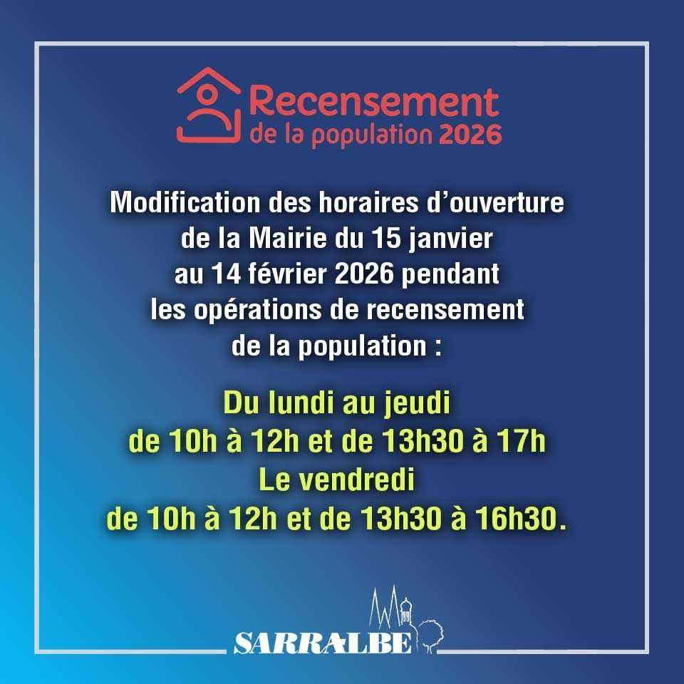 Modification des horaires d’ouverture de la Mairie du 15 janvier au 14 février 2026 pendant cette opération de recensement de la population :